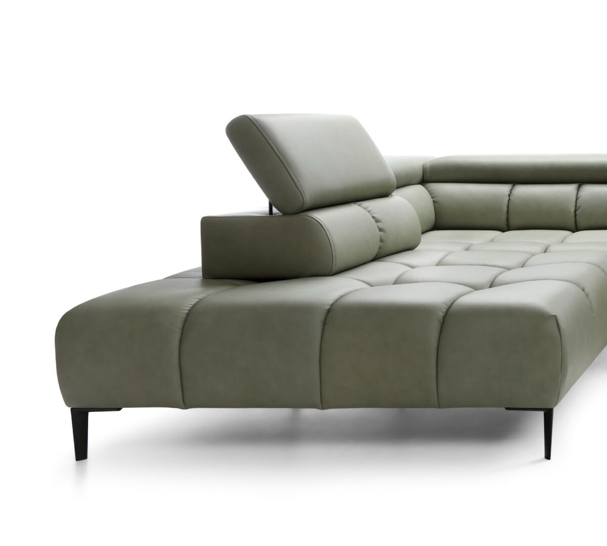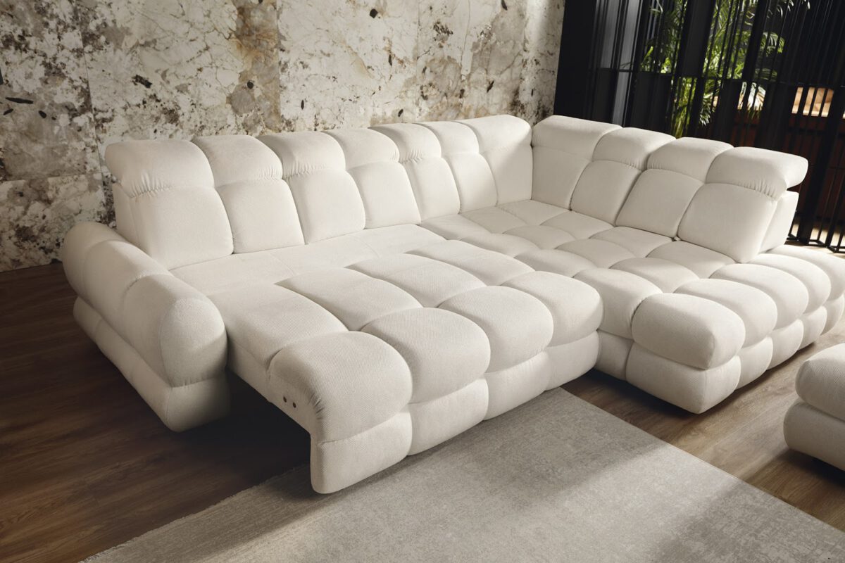 Trzeci model wyróżnia się nieco wyższym siedziskiem i dodatkową powierzchnią do leżenia. Zaprojektowano go tak, by łączyć elegancję z najwyższym poziomem wygody, a regulowane zagłówki można ustawiać w kilku pozycjach. Każdy z tych wariantów dowodzi, że nowoczesny narożnik modułowy z regulowanymi zagłówkami stanowi połączenie ergonomii i stylu, niezależnie od wybranej kolekcji.